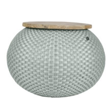 De Halo is een met de hand gevlochten bijzettafel. Een opberger, bijzettafel en poef in één. Multifunctioneel! Onder het houten plateau is een opbergplek te vinden waar met gemak speelgoed, afstandsbedieningen of pennen in opgeruimd kunnen worden. Heb je onverwachts veel mensen over de vloer en stoelen te weinig? Gebruik hem als een extra zitplaats! Met de hand gemaakt van gerecycled plastic en beschikbaar in verschillende kleuren.
